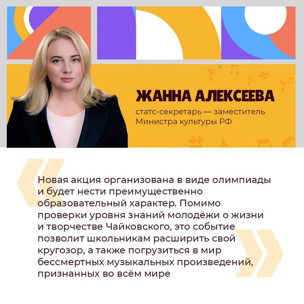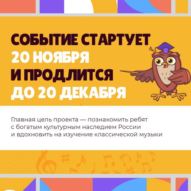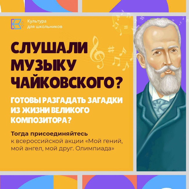 С 20 ноября по 20 декабря школьников ждёт крутое приключение — всероссийская акция «Мой гений, мой ангел, мой друг. Олимпиада» в честь 185-летия Петра Ильича Чайковского. Регистрируйтесь на сайте Культурадляшкольников.РФ и проходите задания. По итогам акции 25 декабря будут объявлены победители, набравшие наибольшее количество баллов. Подробнее о событии — в карточках.
