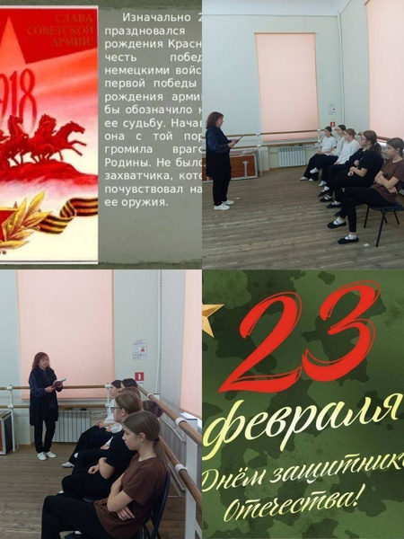 Каждый год 23 февраля в России отмечают День защитника Отечества. История этого праздника должна быть известна и взрослым и детям. Памятная дата служит напоминанием о героизме и самоотверженности тех, кто защищал страну в разные исторические времена. Он олицетворяет мужество и доблесть, которые всегда жили и будут жить в сердцах всех людей. В этот день подчеркивается значимость любви к Родине и единства народа в защите своей страны. В преддверии Дня защитника Отечества с обучающимися хореографического отделения ( преподаватель Н. Ф. Еламкова ; концертмейстер Н. Г. Михайлова) прошёл классный час, в ходе которого дети узнали историю возникновения этого праздника, что 23 февраля - это неотьемлимая часть истории целой страны. Такие мероприятия способствуют формированию патриотического чувства, уважения к людям и любви к Родине.