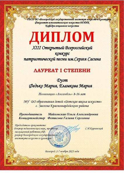 Дорогие друзья и уважаемые коллеги! С радостью сообщаем, что на VII Oткрытом Bсероссийском конкурсе патриотической песни имени Сергея Сасина наши талантливые учащиеся, дуэт Федько Мария и Еламкова Мария, стали лауреатами 1 степени!